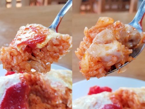 おおぉぉぉ、今日の"オムライス"、、、チキンライスがはみ出しています。。。店主さんのサービスなのでしょうか、、、やや大盛りっぽい感じですねぇ。。。で、気になるお味は 過去記事 をご参照ください、、、ゴロゴロの鶏モモ肉が入った、ケチャップとろりの"オムライス"です。。。うんうん、旨い旨い~☆