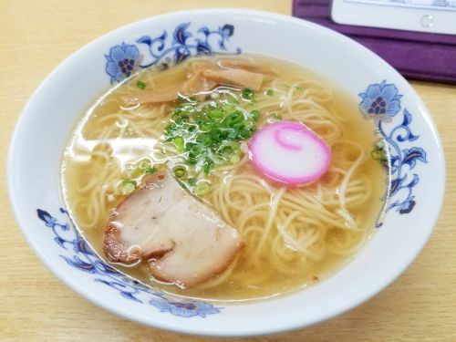 午後1時20分頃にやって来ると、店前の駐車場は埋まっていました、、、なので隣の工場の砂利の場所に白フグ号を停めました。。。店内には4人のお客さんがいましたが、席が一つ空いたのでそちらに着き、"中華そば"と"おにぎり"を注文です、、、いつものように待つこと約3分、アっという間にできあがりです。。。