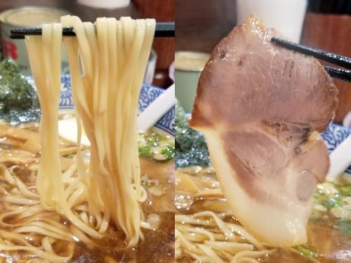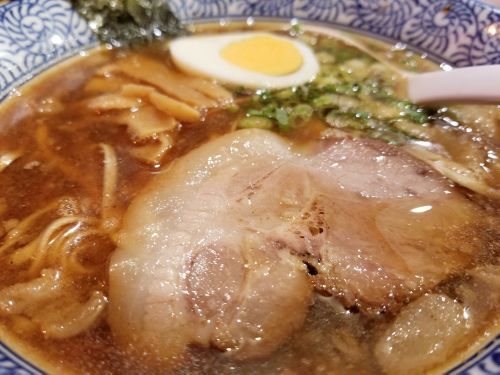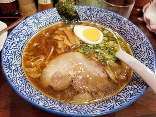 さぁ気になるお味(醤油らーめん)です。。。まず麺は尾道に多い、中太の平打ちほぼストレート麺、、、加水はやや多めでシコシコ、ゆで加減はやや固茹で程度でしょう。。。そしてスープは、ほぅほぅほぅ、、、ベースはやはり尾道系のような魚介系醤油味、、、でも魚粉がしっかり入っているようで、濃厚な魚粉の香りがプンプンしてきます。。。その上に大粒の豚背脂が浮かび、その脂の膜でスープは冷めずアツアツです、、、私的にこのスープは好きですねぇ。。。うんうん、旨い旨い~☆