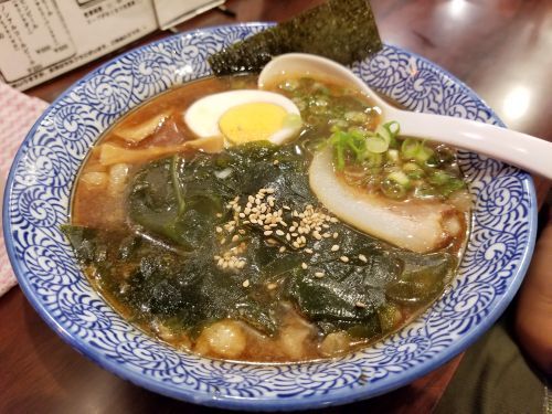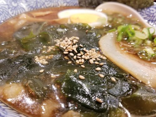 で、トッピングはチャーシュー、メンマ、玉子、ネギと海苔、、、このチャーシューもシャキっとした大きめなので、やっぱり尾道系のような気がしました。。。また家内の食べた"わかめらーめん"、、、こちらには三陸産というわかめがタップリトッピングされています。。。表面に見えている量の約3倍位あるようで、食べても食べてもわかめが出てくるようです、、、コリっとした歯ごたえも良く、わかめ好きにはウレシイトッピングでしょう。。。