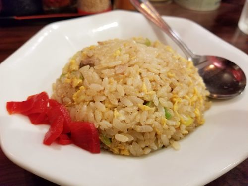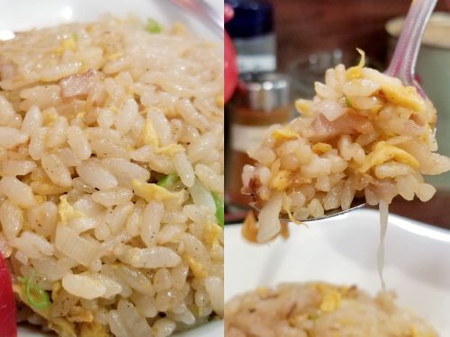 最後に"セットB(半チャーハン)"、、、パラパラとまではいきませんが、しっかり炒められていてGOODです。。。具材は小間切れのチャーシュー、卵、ネギのみの極シンプル、、、でも味が濃いっ!! おそらくラーメンのスープが加えられているのでしょう。。。まぁこのお店らしい"チャーハン"と言えますネっ!!