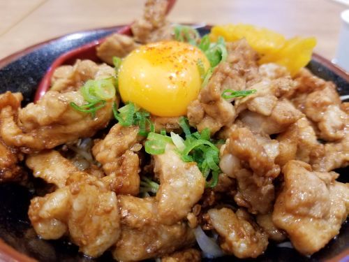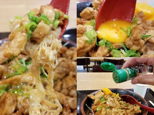 午後1時過ぎに「イオンモール」に到着し、1Fのフードコートにやってきました、、、「豚屋とん一」さんのコーナーの前には、4、5人のお客さんがいます。。。今回私は"かつ丼"には興味がなく"トンテキ"が目的です、、、定食か丼か悩みましたが"トンテキ丼"を発注しました。。。すると目の前で調理が始まり、待つこと約3分でできあがりです、、、ちゃんと調理過程を見られるのは、なんだか気持ちイイですねぇ。。。その"トンテキ丼"をいただき、、、一味をちょっとふって席に持って行きました。。。