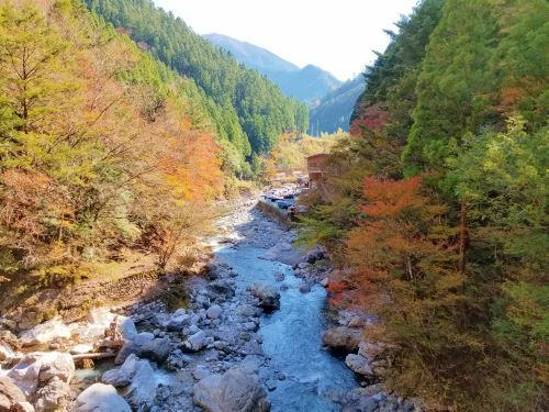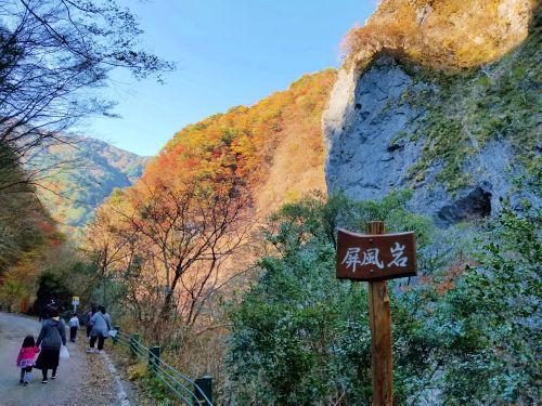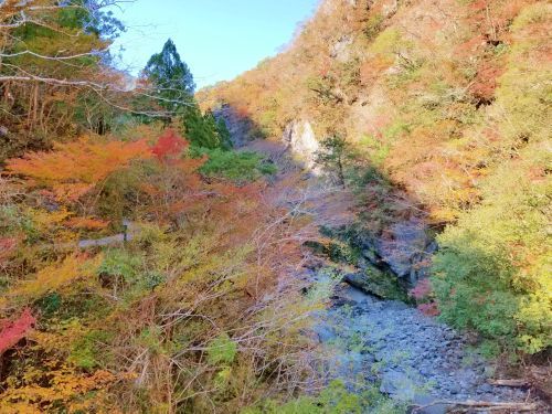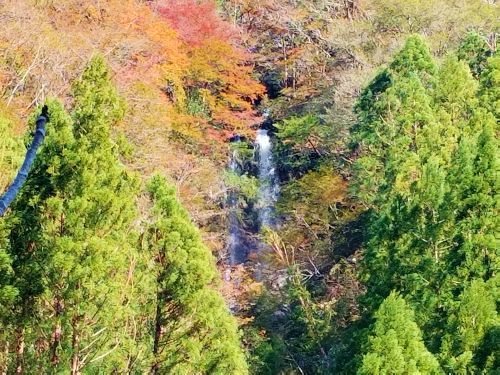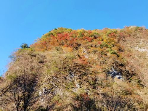 さてネットの某紅葉情報サイトでは、しっかり"見頃"となっていました、、、が、少し遅いようです、、、山の斜面には赤や黄の色づきより、茶色に枯れた木の方が多く見られる上、先月の台風の影響で、大木がなぎ倒されていたり、崖崩れが起きていたりしました。。。うーーんっ、期待大でやって来ただけに、、、ちょっと残念でしたねぇ。。。