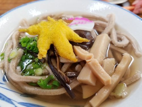 さぁ気になるお味です。。。まず蕎麦は、、、ふっ、太いっ!! まるでうどん並のふとい蕎麦で、逆に長さが短い、、、そして喉越しというようにズルズルっとはすすれず、噛んで食べる蕎麦ですねぇ。。。どうやら十割蕎麦のようで、食感は"蕎麦がき"という感じです。。。また出汁の味が独特でしたので、店員さんに聞いてみると、、、ジャコと昆布の出汁ということでした。。。
