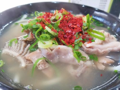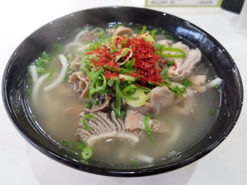 さぁ気になるお味です。。。まず麺は呉うどんのような細麺です、、、でもコシはなくフニャフニャ、、、我がBARIの食堂のような腰ヌケタイプでしょう。。。そして出汁はホルモンのエキスがよく出た、あっさりの塩味のような感じで、、、トッピングの一味唐辛子でピリっと引き締まっています。。。