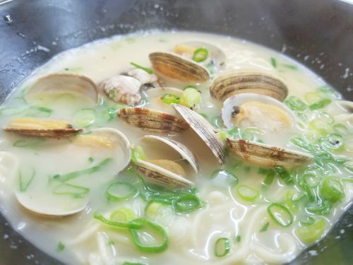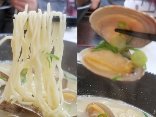 さぁ気になるお味(あさりバターラーメン)です。。。まず麺はやや細めで中加水の手もみ風ウェーブ麺、、、ゆで加減は固ゆででGOODでしょう。。。そしてなんと言ってもスープが絶品、、、塩味ベースで乳白色のクリーミースープに、バターの円やかさと風味がイイっ!!