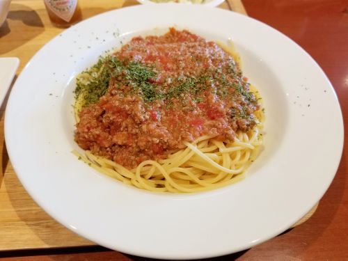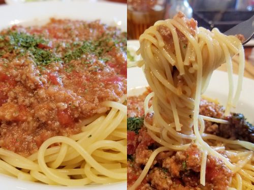 さぁ気になるお味です。。。まずパスタは細めでグミ系タイプ、、、太さを例えるなら、インスタント棒状ラーメン位でしょう。。。もちろんゆで加減はアルデンテでGOOD!! そして細かい挽肉に程よい甘みと酸味のトマトソースが、シャバシャバっとトッピングされています、、、フォークでパスタとソースがうまく絡まるように巻き取ります。。。うんうん、旨い旨い~☆