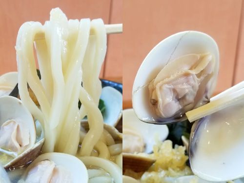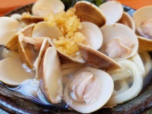 さぁ気になるお味です。。。まず麺はやや太麺のややエッヂが立ったモチシコタイプ、、、程よいコシがGOODです!! そして出汁には"はまぐり"のエキスが溶け込み、とっても高級な味になっています、、、"はまぐりのお吸物"にうどんを投入したような、そんな贅沢な出汁でしょう。。。また"はまぐり"は250gと言うことで、10粒ほどトッピングされていました、、、もちろん身もしっかりいただきますねぇ。。。うんうん、旨い旨い~☆