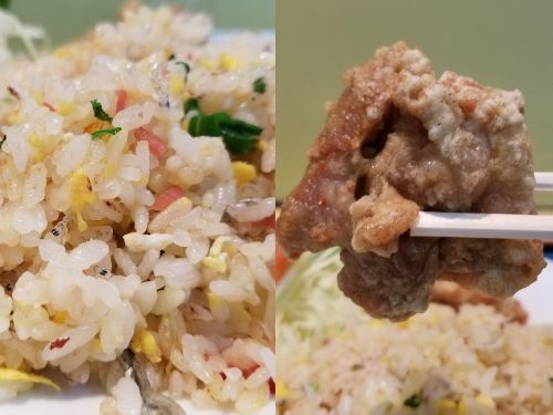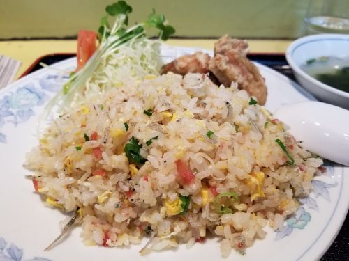 午後1時15分頃に到着すると、今日の私の気分を察知してか、なんと本日のサービスが"梅干しチャーハン"です、、、お値段は530円で変わりはないのですが、これまた私のお気に入りの"からあげ"が付いています。。。入店し迷わず本日のサービスを発注し、、、待つこと約6分でできあがりました。。。