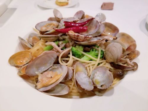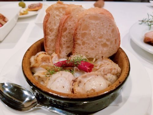 さて今夜のメインは"ベビーホタテのアヒージョ"や"ボンゴレ"です、、、ベビーホタテをバケットに乗せ、オリーブオイルを垂らしていただきます。。。うんうん、旨い旨い~☆