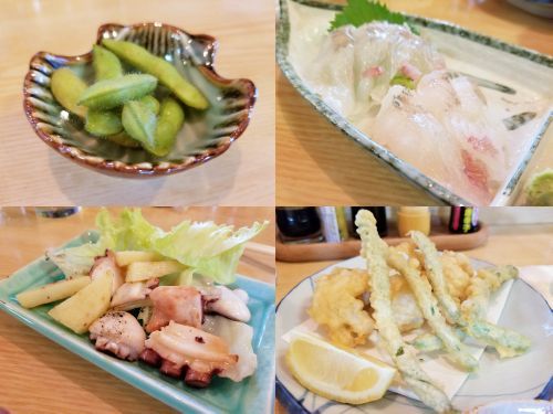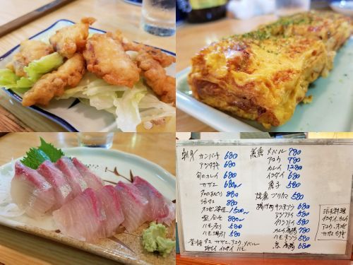 [カコ唐、タコ玉子焼、カンパチ刺身]