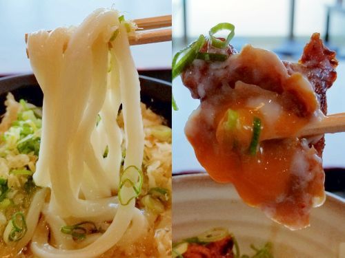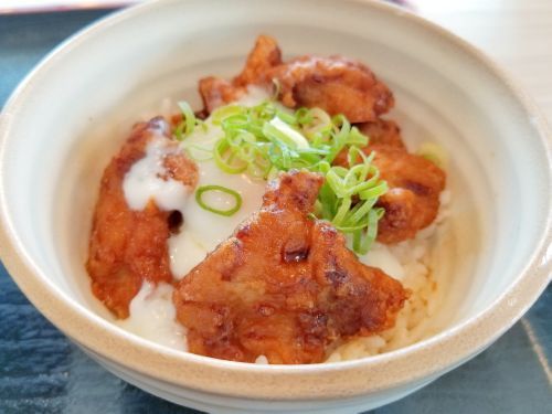 次に"とり唐丼"。。。1個を半分にカットした唐揚が4個、温泉玉子と一緒にトッピングされています、、、そこに少し甘みのある醤油タレのようなものがかかっています。。。ご飯の量は小さいお茶碗に一杯ほど、、、でも"うどん"にボリュームがあるので、これ位がちょうどイイんですねえ。。。うんうん、旨い旨い~☆