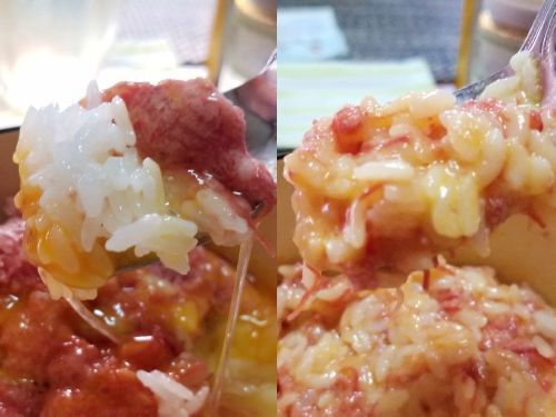 さぁ気になるお味です。。。くずしながら食べるも良し、よく混ぜて食べてもよしと言うことでしたので、まずはくずしてそのまま、、、うーーんっ、コンビーフです。。。(笑) 次によくマゼマゼして、、、ほぅほぅほぅ、私的には混ぜた方が好きですねぇ。。。確かにほんのり出汁のような味わいも感じますが、私はちょっと醤油を足していただきました、、、うんうん、旨い旨い~☆