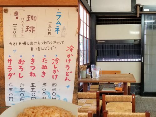 そこで今日のお昼は「かねと食堂」さんに決定、、、午後1時15分ころに暖簾をくぐりました。。。入り口でまずメニューを見て提供を確かめ、「かねと」さんのうどんは量が少なめなので、今日は"冷かけきつねうどん"を大盛でお願いし、代金を払って席に着きました。。。