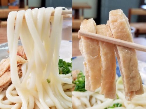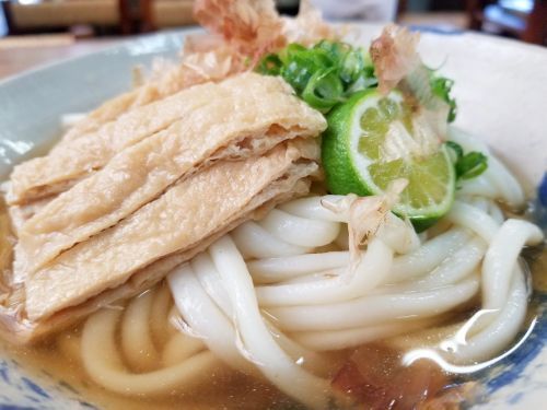 さぁ気になるお味です。。。まずうどんは中細くらいで今治風のフニャ麺タイプです、、、でも冷やしでしめられているので、意外ととコシを感じます。。。そして出汁はおそらくイリコ系、、、でも冷やしなのでやや濃いめでしょう。。。またトッピングは刻んだ揚げ、鰹節、ネギ、スダチ、、、ほんのりスダチの酸味と、鰹節のミックスされた風味が出汁に加わります。。。うんうんアッサリでサッパリ、、、うんうん、旨い旨い~☆