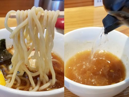 さぁ気になるお味です。。。まず麺は、こってりの時は全粒粉タイプだと思ったのですが、ツブツブが見られないので、こちらは「武吉」さんのタイプの方かなあぁぁぁ??? 太麺で加水やや多め、ウニウニウェーブがかかっています、、、茹で加減はほどよい固茹でで、ツルっとした喉越しにクニっとしたコシがGOODでしょう!!
