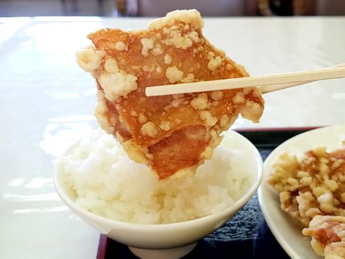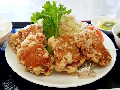 お店に到着したのは午後1時20分頃、、、店内には1組と1人のお客さんが座っていました。。。私は空いていた席に着き、迷わず"からあげ定食"をご飯少なめで発注です、、、やがて待つこと約10分、注文ができあがりました。。。
