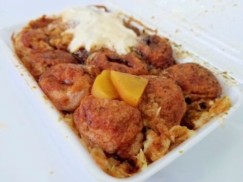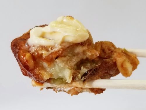 さぁ気になるお味です。。。まずフワフワトロトロ~の円やかな生地に、プリっとした食感のタコがGOOD!! また独特な風味のソースとタップリのマヨネーズ、、、そしてタクワン2切れが数切れ付いているのも特徴です。。。うんうん、旨い旨い~☆