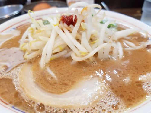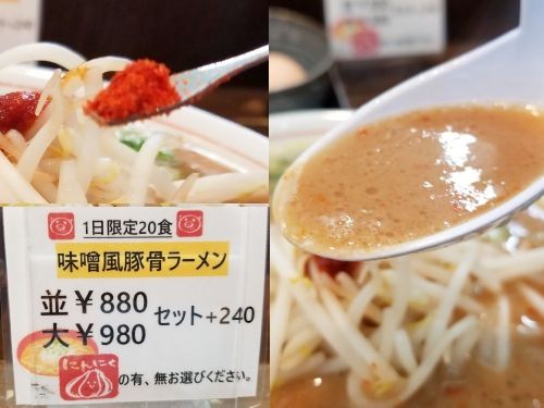 さて暖簾をくぐったのは午後1時10分ころ、、、でも少し混んでいるようで、入り口で5、6分、順番を待って入店です。。。カウンター席に着いた私は、今日は迷わず"味噌風豚骨ラーメン(並)"を、昼なのでニンニク無しでお願いしました。。。そして待つこと約15分、、、"味噌風豚骨ラーメン"のできあがりです。。。