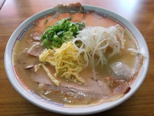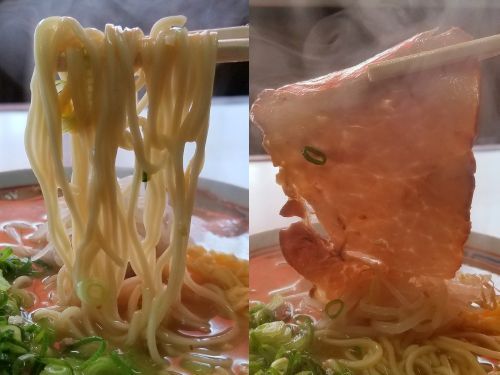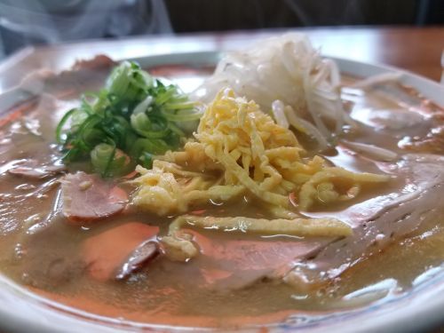 さぁ気になるお味です。。。と、その前に、できあがった"中華そば"を見てると金糸玉子がトッピングされています、、、このトッピングは初めてかなあぁぁぁ。。。で、まず麺は中細で中~やや低加水の緩いウェーブタイプ、、、ゆで加減は固くも柔らかくもなく、モチシコ食感です。。。そしてスープは、広島らしい醤油豚骨ですが、表面に脂の層がマッタリと浮かび、やや濃厚な感じです、、、でも味自体はアッサリしていて、見た目とのギャップがありますねぇ。。。