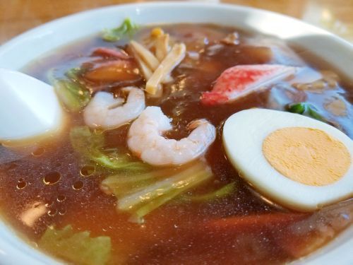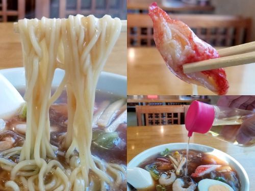 さぁ気になるお味です。。。まず麺は中細で加水多め、手もみ風の緩やかなウェーブタイプ、、、ゆで加減は程よい固茹ででGOODでしょう!! そしてスープは、タップリの具材がトロ~リ餡かけになった、やや甘みのある醤油味、、、私はこの餡かけタイプには、お酢をくるりと一周廻しかけます。。。また具材やトッピングはゆで卵、豚肉、むきエビ、白菜、玉ねぎ、カニカマ、筍(メンマ)、ネギ、キクラゲ、カマボコ、天ぷら(カマボコ)などなど盛りだくさん!! うんうん、旨い旨い~☆