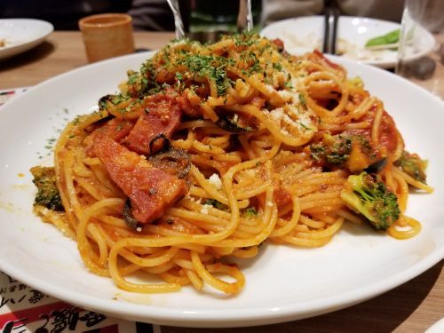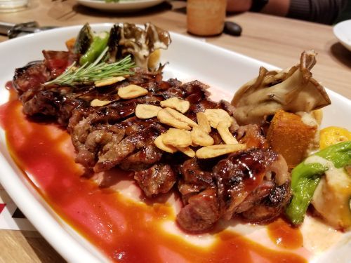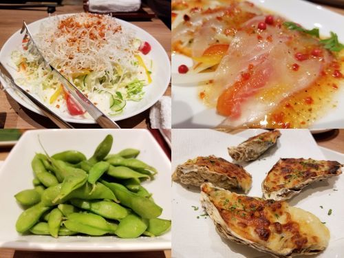 さて料理は"熟成肉盛りコース(90分飲み放題付き)"でお願いしていました、、、料理の内容は、真鯛のカルパッチョ / 和牛の焼きしゃぶ / 完熟トマトのミモザサラダ / 活サザエのエスカルゴ風 トースト添え / イタリア産サラミのピザ / ドイツ産ソーセージのグリル ポテトとピクルス / 熟成肉のステーキ ブルーチーズのソース / 本日のパスタ / パティシエ特製デザートです。。。