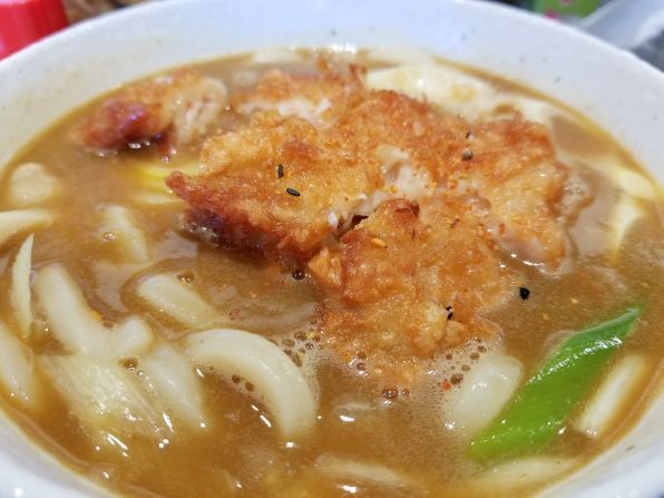 さて遅い時間でしたが、店内は少し混雑しています、、、テーブル席には空きがなかったので、私はカウンター席に着きました。。。そして"カレーライス"ではなく、、、冬場に提供されている"カレーうどん"を"パリパリチキン"でお願いしました。。。やがて待つこと約5分、、、注文のできあがりです。。。