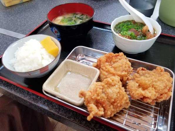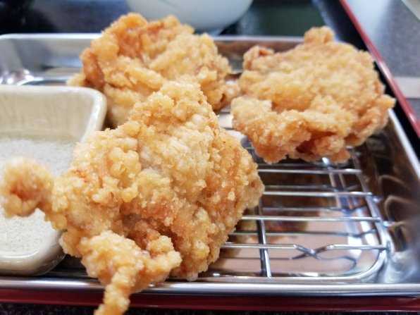 さぁ気になるお味です。。。まず"から揚げ"は、パリパリの衣にジューシーな鶏肉、部位はおそらくモモ肉でしょう、、、ガシュっと囓るとジュワっと肉汁が出てきます。。。こんな"から揚げ"は白いご飯によく合います!!