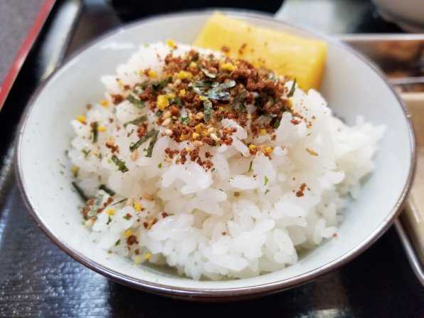 やがて待つこと約10分でご飯が炊きあがったのですが、おかずがもう少し時間かかりさらに約5分、、、おかずとタイミングを合わせて、セルフのご飯と味噌汁(おかわり自由)をよそって、ふりかけ(無料)もかけて、できあがりです。。。