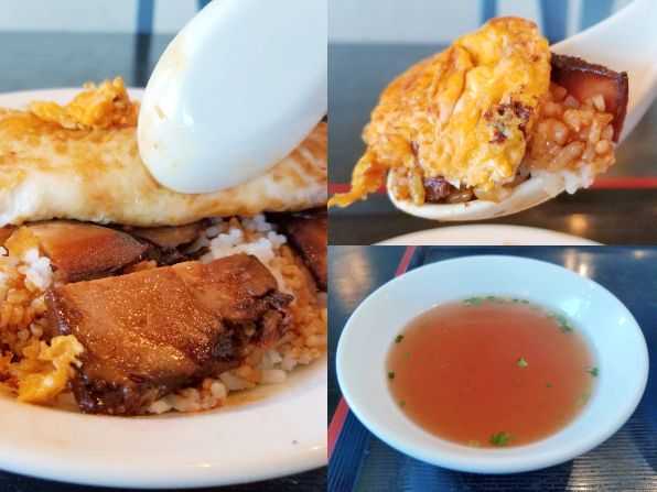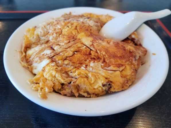 午後1時20分頃に入店すると、店内にお客さんは二組です、、、私は空いていたテーブル席に着き、予定通り"焼豚卵めし"を両面焼でお願いしました。。。一般的な"焼豚玉子飯"は、焼豚の上に半熟目玉焼きがトッピングされています、、、両面焼きと言うのは裏メニューで、卵を潰して両面を焼いた玉子焼きをトッピングしてもらうのです。。。実は私はこの両面焼きの方が好きなのです!!
