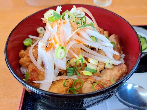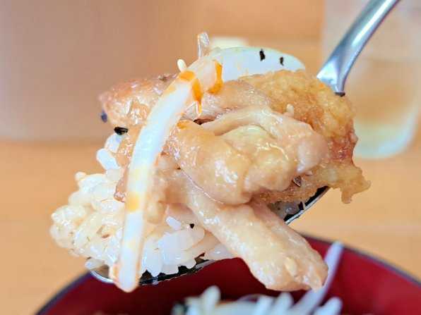 さぁ気になるお味です。。。"バリ丼"はネギのみでしたが、"赤のバリ丼"には玉ねぎもトッピングされていて、そこに赤い、多分ラー油がかけられています、、、その下には鶏皮の唐揚げと、炒めたセセリがご飯を覆うように盛りつけられています。。。
