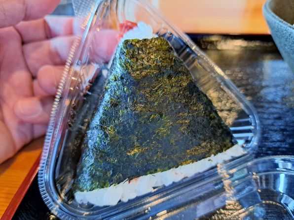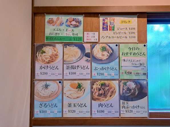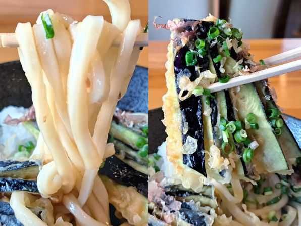 [揚げナスぶっかけうどん(温・並):¥450、紀州南高梅おにぎり:¥120]