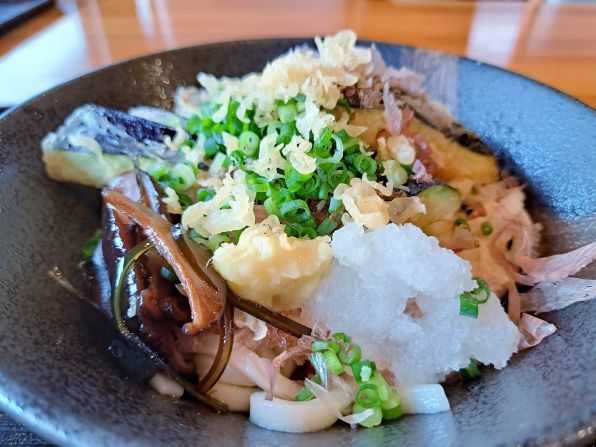 午後1時45分頃の遅い時間、、、店内にお客さんは1人でした。。。私は今日のおすすめうどんの"揚げナスぶっかけうどん"と"紀州南高梅おにぎり"を選び、うどんは温でお願いしました、、、揚げナスに少し時間がかかるのか、席で待つこと約3分、できあがったうどんを受け取り、ネギ、大根おろし、生姜、天かす、しいたけ昆布をトッピングして席に着きました。。。