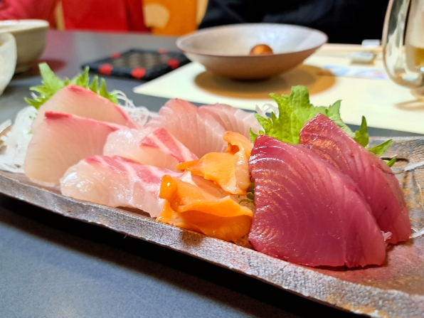 お酒を飲みながら、食事をしながら当選番号を確認していきます、、、なので見落としも多いのですが、今年は高額当選はなかったものの、5万円が2本当たりました。。。料理は刺身盛合せ、鳥皮やイギス豆腐、牛すじ煮やモツ煮、ひじきなどを注文しました!! うんうん、旨い旨い~☆