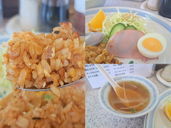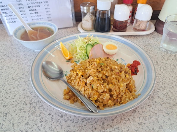 午後1時半前に入店すると、店内にお客さんはいません、、、祖鳥の私はカウンター席に着き、今日は迷わず"カレー焼飯(定食)"をお願いしました。。。やがて待つこと約5分、、、定食のできあがりです。。。