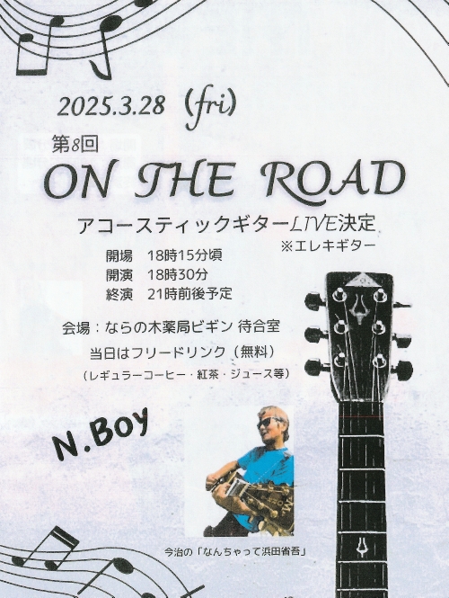 今夜は今月の28日に「ならの木薬局ビギン」さんで開催される、「第8回 ON TE ROAD」のライブの音合わせを、NSさん、S部君と三人で行いました、、、そして午後9時になったので、三人で食事に出かけましたねぇ。。。