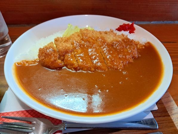さぁ気になるお味です。。。大皿に大きなトンカツ、、、そして赤とオレンジ色の中間位のデミグラスソースが、カレーのルーのようにタップリかかっています。。。カツはもちろん揚げたてサクサク、衣にソースが浸った部分は、ジュワっとしています、、、ソースはやや酸味が強めで、食べるに連れ少し汗ばんできました。。。でもそのカツとソースが白いご飯によく合いますねぇ。。。うんうん、旨い旨い~☆