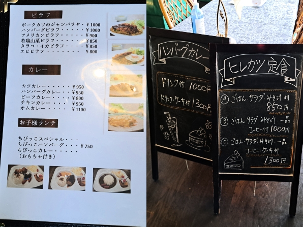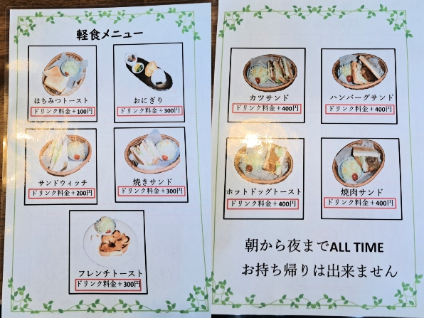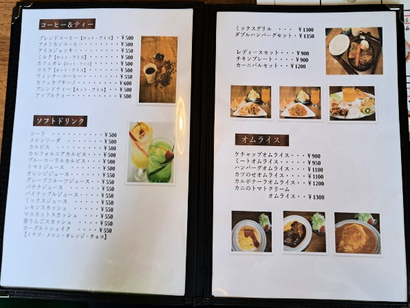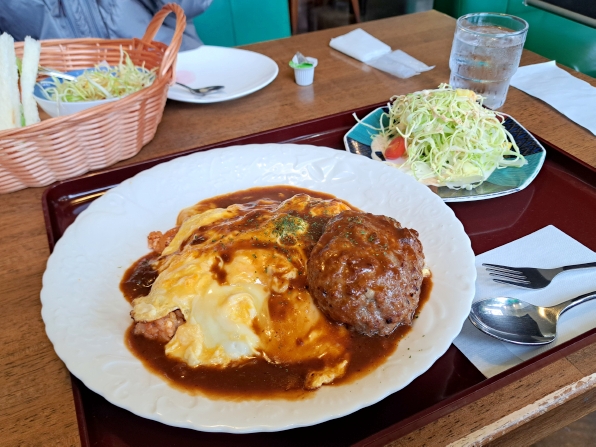 12時20分頃に入店すると、店内には4組位のお客さんがいます、、、我々は表が見える4人掛けのテーブル席に着き、母は"サンドウィッチ"+"ほっとコーヒー"、、、私は"ハンバーグオムライス"+"トマトジュース"をお願いしました。。。やがて待つこと約6分、、、注文のできあがりです。。。