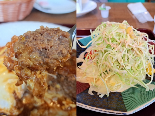 さぁ気になるお味(ハンバーグオムライス)です。。。大皿にはチキンライスを覆ったオムライスに、デーーンと大きなハンバーグがトッピングされ、デミソースがかかっています、、、ハンバーグは肉がしっかり詰まっていて肉厚、食べ応えがありますねぇ。。。