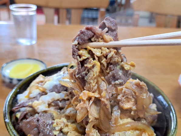 さぁ気になるお味です。。。肉厚で食感のあるタップリの牛肉が、玉ねぎと一緒に卵で綴じられています、、、そして出汁の味は田舎の婆ちゃんが作ってくれていたような、ほんのり甘くて懐かしいぼっかけ系。。。うんうん、旨い旨い~☆
