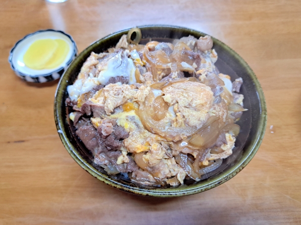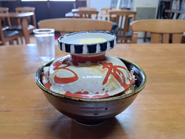 午後1時30分頃に入店すると、店内にお客さんはいません、、、私は空いていたテーブル席に着き、迷わず"他人丼"をお願いしました。。。やがて待つこと約5分、、、昔ながらの、蓋上にタクワンのスタイルで着丼です。。。