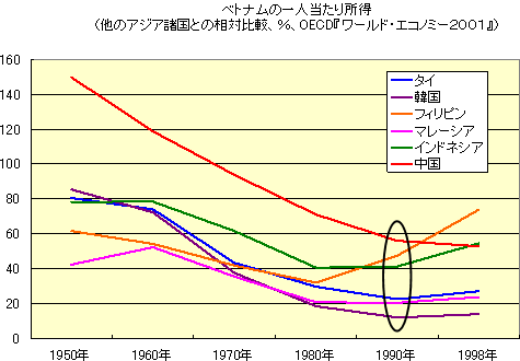 今日のまとめ 1. 高度成長国の多くは一度経済のひどい低迷や破綻を経験している 2. ベトナム経済も長く険しい道のりを歩んできた 3. ドイモイ政策の発表される直前のベトナムのインフレ率は700% 4. ドイモイ政策導入後農業とサービス業が最初に立ち直った■出遅れ 中国やインドやロシアなど、最近高度成長を遂げている国々には或る共通点が見出せます。それはこれらの国の経済の発展段階のある時期に各国とも経済のひどい停滞や混乱や破綻を一度経験しているということです。そうした経済の低迷はその国の提供する財やサービスの価格を極端に低くリセットする効果があり、それが価格競争力の面で圧倒的な優位に立つことが出来る機会を提供するのです。勿論、ベトナムの場合も例外ではありません。ベトナムの場合、1954年のジュネーブ会議以降、独立国としての道を歩み始めたのですが最初は極めて険しい道のりであったと言えます。下のグラフからもわかる通り、他のアジア諸国に対してベトナムは相対的地位の低下を経験したのです。 このグラフはそれぞれの年のアジア諸国の所得を100とした場合、ベトナムの所得がその何パーセントに相当するかをグラフ化したものです。例えば中国の 1950年の所得に比べるとベトナムは149.9%、つまりベトナムの方が49.9%豊かだったわけです。ところがベトナムはどんどん中国より困窮化し、 1998年までにはベトナム人の一人当たり所得は中国の半分程度になってしまいました。つまりこのグラフは右肩下がりになればなるほどベトナム人の相対的所得水準は低下していることを意味するのです。実際、1990年頃まではアジアの全ての国に対してベトナムはアンダー・パフォームしていることが読み取れます。(唯一の例外はフィリピンで対フィリピンでは1980年頃からベトナムが差を縮め始めています。これはフィリピンの経済の低迷が原因です。)ベトナムの経済が駄目だった原因は言うまでも無く1950年代から1980年頃まで絶え間なく続いた一連の戦争にあります。ベトナムは疲弊し切った経済をテコ入れするために1986年にドイモイ政策という経済改革を打ち出します。その結果、1990年頃を境にベトナムの相対的地位は盛り返し始めます。■ハイパー・インフレと貿易赤字 1986年当時の同国の経済の疲弊度合いはインフレ率と貿易収支の数字からもうかがい知ることができます。ドイモイ政策が発表される直前のベトナムのインフレ率は年率700%を超えていました。 また、輸入額が輸出額の2.44倍に達し、ソ連など外部からの経済支援が無い限り国家運営の破綻は免れない状況になりました。 1980年代のベトナムは共産党の下で国民はソ連を除く外国企業や外国人との接触は極力避けるように指導されていました。このことは経済運営はもちろんのこと輸出を目指す製造業や農業も外からのノウハウを取得しにくい状況に置かれていたことを意味します。■ドイモイ政策 ドイモイ政策は1986年の第6回共産党大会で正式に発表されました。そこでは経済のてこ入れをするために利用できるツールは全て積極的に使ってゆこうということが提唱されました。具体的には財政政策、金融政策、賃金政策、価格政策などの面で新しいことを試すことが提案されたのです。そして政府が国家にとって戦略的に重要だと考えていない分野に関しては徐々に私有財産を認め、市場経済を認めることにしました。とりわけ外国との自由貿易、外資の導入、農業分野のてこ入れ、日用品などの消費財の増産が決められました。 ドイモイ政策導入直後はサービス業と農業が著しく成長しました。この一方で工業セクターが一旦マイナス成長に落ち込んでいるのは重厚長大型の計画経済モデルに依拠した重工業への支援を止める決定を下したことが影響しています。