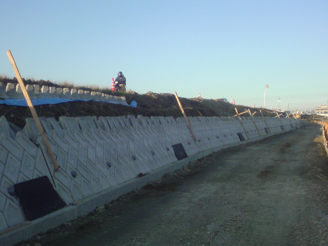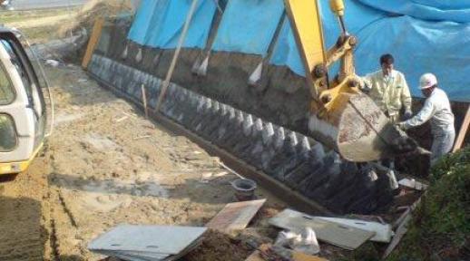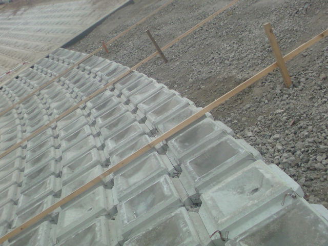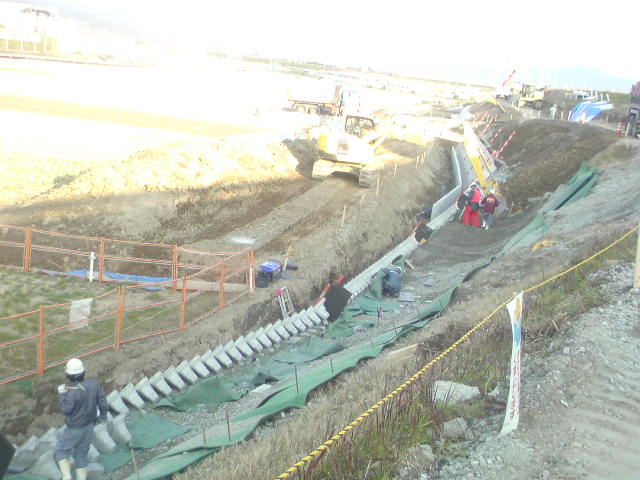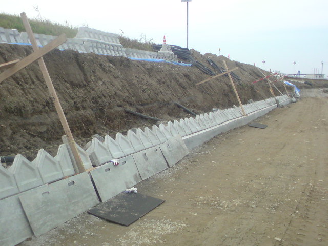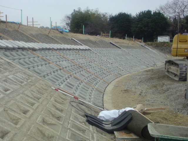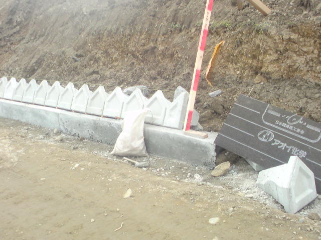 もう四時を回って入るのに生コンが着ましたよ。今日、七段行きそうですね。私はほとんど車の中です。ナンワストーンとは付き合いが長いです。二十年以上前に和歌山の根来でスカイタウン?で積みました。その後すぐに加太のスカイタウンでいっぱい積みました、南和産業の服部氏とはその時お会いしました。このブロックの限界点は千二百個位かな。石屋としては天才と二十歳から言われました(自称?)現場では負けた事がないのでしょうがないよね。この現場は五十個しか並んでいないので一段積むのに十分位かな、そろそろ段取りが出来たみたい、表に出て積もうかな、今、息子に教えています。頑張れ息子よヘッピリ腰だど
