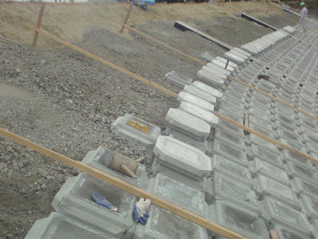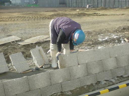 もうじき五時だよ 椿石工業ここで石ブロック積の基本をまずこのげんばは四分勾配です。カマシ物(カイ板)という具利石をカマシます、水平にです、これが基本です。四分勾配なので、少しブロックの顔の方に寄ります。五分の場合はもう少し後ろです、あくまで水平です。石の重心を捕まえるのが大事です、ブロックの方が解りやすいよ。石も同じでも難しいあくまで水平、動くと目違いになります。後は糸に合わす。糸はブロックと透かして紙一枚ぐらいです(紙の厚みぐらい)。私は直線の場合はよく糸の前で合わします、糸の厚みは紙五枚位あります。職人ならこれくらい当たり前です、一時間に百個積めないのは職人じやないです。