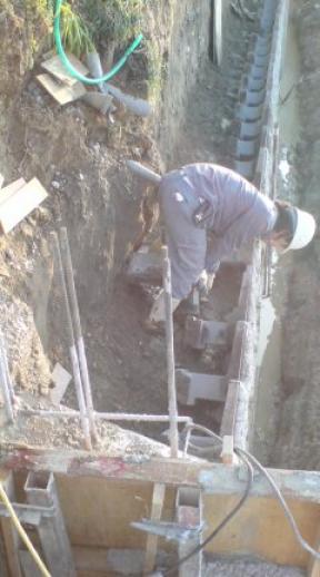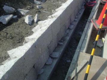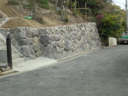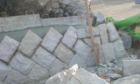 昨日の現場、少し残っていまいました。コンだけですがコンクリートをハツルため昨日で出来ませんでした(ハッル機械がなかった)。アイエスアイの社長に怒られそう(少しだけ残しやがって)こんな感じでハッリ、積み直しです。谷があってないから大変なんですよ。高さ幅、谷の構成、石積て面白いですよこんな物かな。