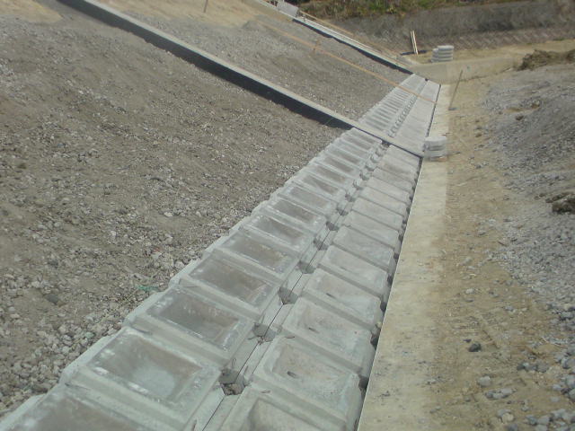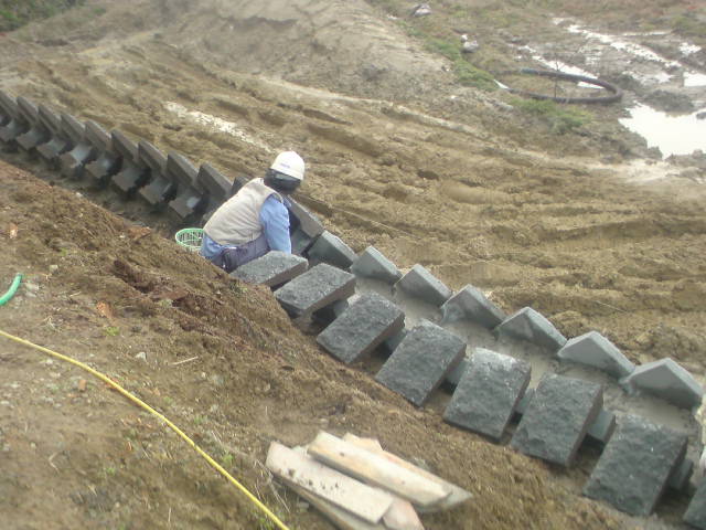 ブロックを積む基本が大事です、 椿石工業私ももう五十歳(嫌になりますね)石積職人か?ブロック職人か今から三十五年ほど前の仕事は石とブロックが七三で石の方が多かったです。昔、弟子時分、家に職人が三十人から四十人居ました、親父が親方をしていて、弟子、職人、出稼職人(外注ですね)。色々な職人が居ましたよ、今考えるとめちゃくちゃですよ、職人のケツふきによく現場に行きました、弟子時分ですよ、その時からこんな職人に成っては駄目だと思いました。会社になって二十年、弟子も十人以上育てました(まともな弟子は一人も居ないな)まあ弟子の話はまたぼちぼちと、今の時代に基本を説いて行きます。この現場は延長が八百メートルあるらしい。先が見えないよ。これだけあると逆に昼間で積むと(四百個)段取りになるよ。昼からは息子に任せ車でブログを書いてます。がんばってね、追われてから早く積むのでは駄目追われてない時に早く積む練習をしなさい。石の心より