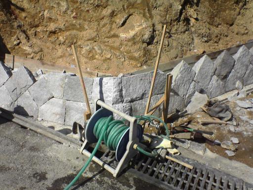 朝はやくからこそこそと 椿石工業 激安墓石昨日の現場は大型ブロックで難しいかった。大型ブロックは手間が掛かり手元の呼吸が物を言うよ。特にカーブは面倒臭いよ、糸を色々と張るのも手間が掛かるし。勾配とカーブの加減が難しいよ。社長の現場だから神経を使うよ。
