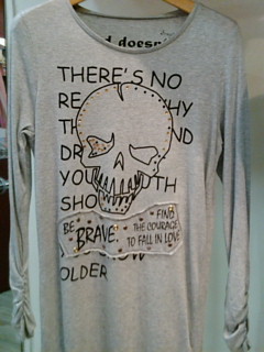 今日はスカルのロングTシャツをご紹介します今ちまたでは・・・スカル柄大流行ですねジルコンとビスの組み合わせがとってもおしゃれお袖はくしゅくしゅこんな感じで~すサイドもくしゅくしゅ背中の部分は内側にロゴですよ~色は薄いグレー 濃いグレーのほかに白もありま~すサイズは フリーサイズプライスは 15540円12432円 お問い合わせは072-722-1103 I・T fashion company