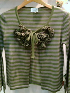 こんにちは今日は朝から久々の涼しくお仕事させてもらってますお店の近所にデイリーヤマザキがOPENして昨日はバケツ今日はエコバックのプレゼント早速朝からいただいてきました焼きたてパンはその場で焼いててふかふか最高でしたよさてさて今日は胸元のふりふりがとっても可愛いボーダーカーデをご紹介しま~す素材はウール100%ですがゲージが細いので秋の初めから真冬までインナーを変えれば長く着れて超お薦め胸元がとにかくチャーミングお袖はこんな感じです入荷後すぐにお色違いは売れてしまいましたがカーキも秋にぴったりなお色でおしゃれですよ お値段は 19950円 お問い合わせは 072-722-1103 I・T fashion company