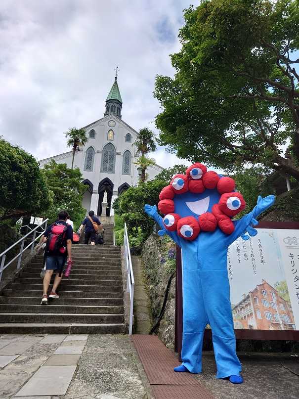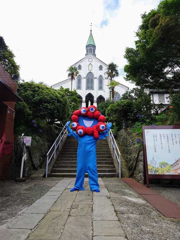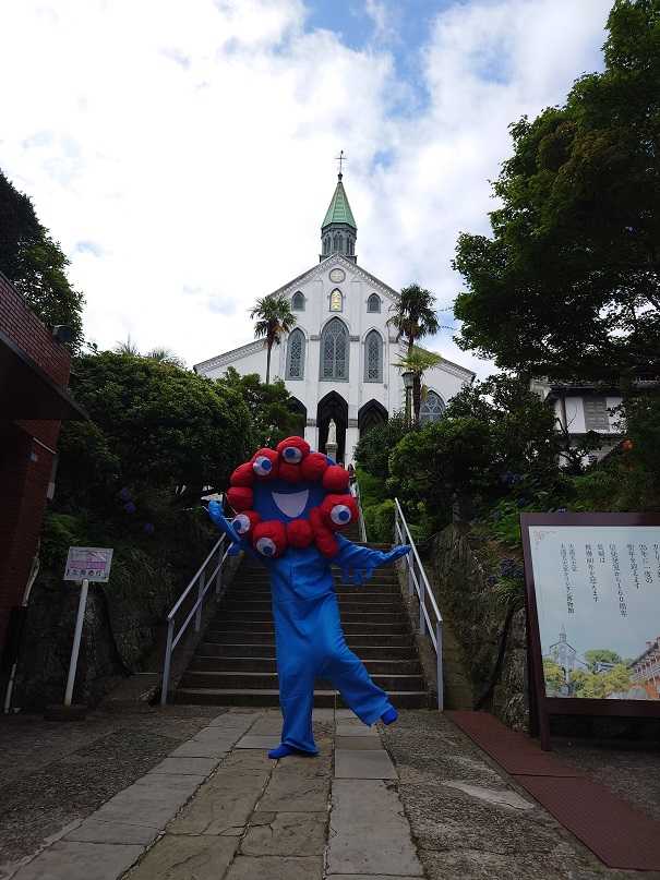 ミャクミャクのコスプレして、長崎県の大浦天主堂にやってきました。到着 さすが、大浦天主堂。 美しい。 観光客さんもいっぱい。 誰も目を合わせない(笑) 正面で撮ってもみました。 素敵~ 最後に、 てへっ
